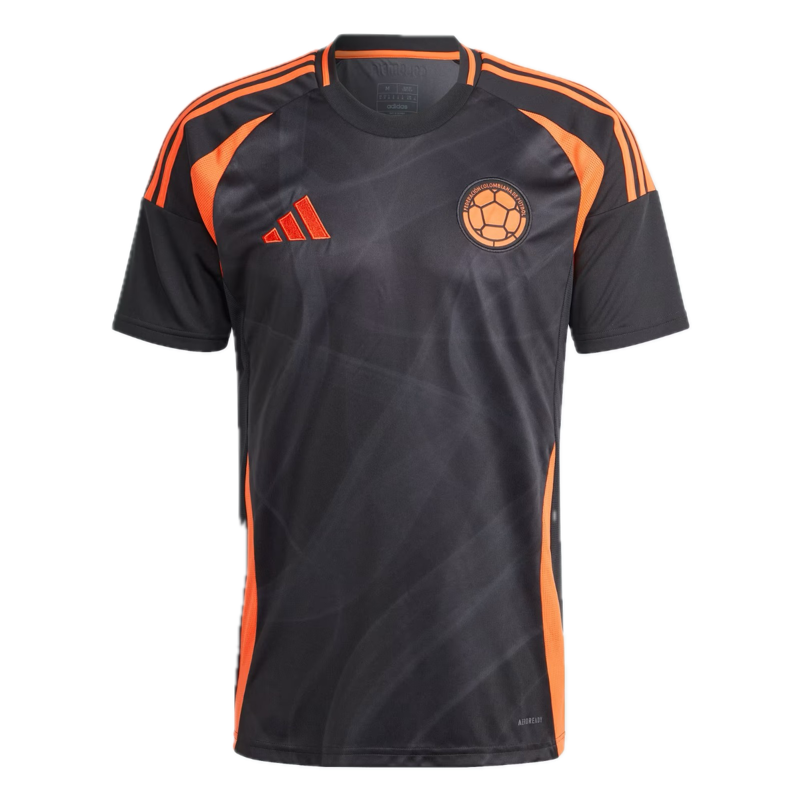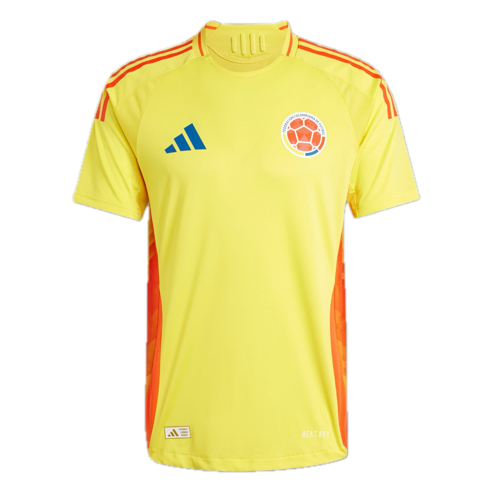 The Adidas Colombia 2024 Copa America football shirt boasts a vibrant design, blending a yellow backdrop with blue logos and red accents.